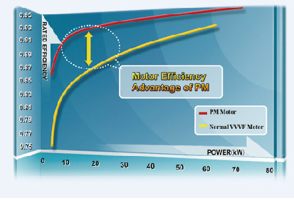 采用了具有巨大節(jié)能效率的、性能優(yōu)越的永久磁石(IPM)電機(jī),搭載新一代寬量程永磁變頻控制系統(tǒng),發(fā)揮出通用感應(yīng)電機(jī)無法比擬的節(jié)能效果,與普通變頻電機(jī)(感應(yīng)電機(jī))相比,電機(jī)節(jié)能7%以上!
