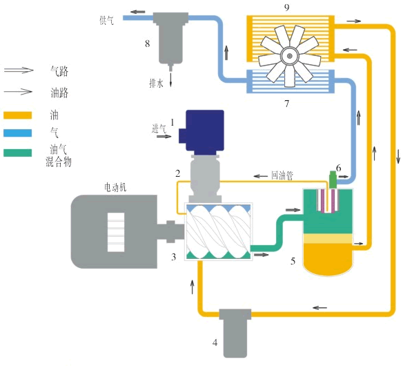 2. 主機(jī) 4.油過濾器 5.油氣分離器 9.油冷卻器