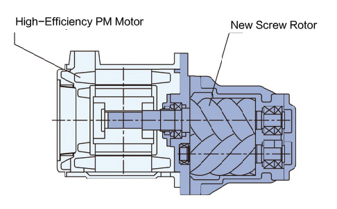 電機(jī)和螺桿主機(jī)采用同軸直聯(lián)一體結(jié)構(gòu),消減了傳動(dòng)能耗,實(shí)現(xiàn)高效化。