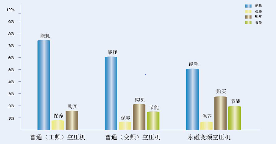 購買空壓機(jī)時(shí),傳統(tǒng)意義上的成本(即購買成本+保養(yǎng)成本),其比例只占到總成本的25%,而能源消耗卻占到了75%。